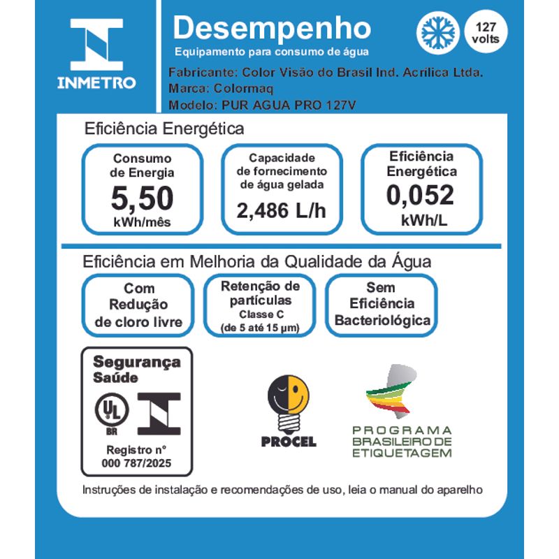 Imagine ter água gelada e purificada sempre à disposição, sem precisar de galões, sem complicações e com um design que valoriza seu ambiente. Com o Purificador PRO Colormaq, isso é realidade. Equipado com sistema de refrigeração por compressor, ele oferece água realmente gelada, ideal para os dias quentes e para quem não abre mão de conforto. São 8 opções de temperatura (1 natural e 7 geladas), para você escolher como prefere se hidratar. Com capacidade de 2,3 litros de água gelada, o reservatório atende tranquilamente toda a família. E mesmo se faltar energia, você continua tendo acesso à água natural e purificada, graças ao sistema inteligente do aparelho. A instalação é simples: pode ser colocado sobre a mesa ou em gabinete, ligado diretamente à rede de água dispensando o uso de galões. A bandeja é removível, facilitando a limpeza no dia a dia. O filtro tem vida útil de até 4.000 litros ou 6 meses, e a troca é feita pelo prático sistema Gira Fácil, sem ferramentas ou complicações. Tudo pensado para tornar sua rotina mais leve e saudável. Disponível na elegante cor branca, o Purificador PRO Colormaq combina com qualquer ambiente. Compacto e funcional, está disponível nas voltagens 127V ou 220V, com temperatura de operação entre 5°C e 40°C. E para sua tranquilidade, o produto conta com 1 ano de garantia sendo 3 meses legais e 9 meses adicionais oferecidos pela Colormaq. Mais conforto, mais saúde e mais estilo para sua casa. O Purificador PRO Colormaq é a escolha certa para quem valoriza qualidade e praticidade. Adquira o seu e transforme a forma como você consome água todos os dias.